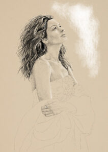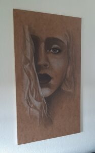 Tegnet på en grundet 6 mm masonit plade på 80 x 120 cm, herefter lakeret.